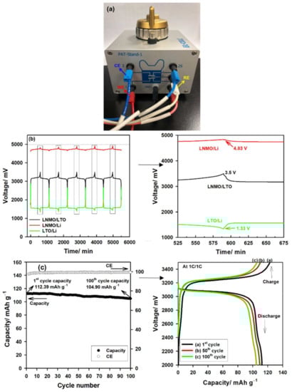- Yang, C.-C.; Hu, H.-C.; Lin, S.J.; Chien, W.-C. Electrochemical performance of V-doped spinel Li4Ti5O12/C composite anode in Li-half and Li4Ti5O12/LiFePO4-full cell. J. Power Sources 2014, 258, 424–433. [Google Scholar] [CrossRef]