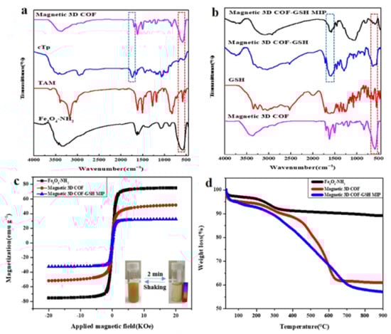 FT-IR spectra of (a) magnetic 3D COFs and precursors, (b) magnetic 3D COF–GSH MIPs and precursors, (c) magnetization curves of magnetic nanoparticles after each modification step, and (d) TGA analysis of magnetic nanoparticles.