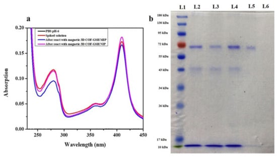 (a) UV–Vis analysis and (b) SDS–PAGE analysis for compatibility of magnetic 3D COF–GSH MIPs/NIPs. L1: Marker, L2: PBS with spiked proteins, L3; and L4: supernatant solutions after adsorption with magnetic 3D COF-GSH MIPs and NIPs respectively, L5; and L6: Eluted solutions from magnetic 3D COF-GSH MIPs and NIPs in 0.5% SDS and 0.1% HOAc (1:1) respectively.