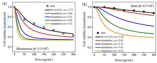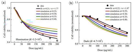 The impact of the NM’s morphological aspects on the biological response will be explored in this study using Equation (4), starting with the fitting parameters extracted from the analysis of the cell viability assay (MTT assay) performed with the HepG2 cell line incubated with the F:GQD, in the dark and under visible light illumination (see [33]). Importantly, the MTT test under visible light was performed to probe the capability of the F:GQD sample in generating ROS and therefore to explore its future application in PDT [33]. Symbols in Figure 1a,b represent the experimental values of the cell viability () under illumination (black open circles) and dark (black solid circles) conditions, respectively. Additionally, in Figure 1a,b, the black solid lines represent the best fit of the experimental data using Equation (4). Colored solid lines (red, blue, green, and orange) in Figure 1a,b represent simulations performed with the experimentally fitted parameters (, , , , and ) but with increases in the mean size () from 2.0 nm up to 3.5 nm, as indicated in the figures’ legends. Note the two full sets of fitted parameters (, , , , and ) collected in Table 1 and extracted from fitting the experimental cell viability data under illumination (Figure 1a) and dark (Figure 1b) conditions. Likewise, symbols in Figure 2a,b represent the experimental values of the cell viability under illumination and dark conditions, respectively. In Figure 2a,b, the black solid lines represent the best fit of the experimental data using Equation (4). Similarly, colored solid lines in Figure 2a,b represent simulations performed with the corresponding two full sets of experimentally fitted parameters (, , , , and ) but with increases in the size dispersity () from 0.25 up to 0.40, as indicated in the figures’ legends. The two full sets of fitted parameters (, , , , , and ) collected from the cell viability experiments (black open and solid circles in Figure 1 and Figure 2) and representative statistical values of the fittings (goodness-of-fit) for both experiments (dark and illumination) are collected in Table 1.