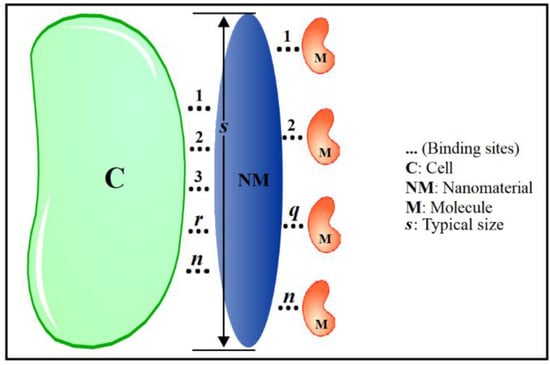 The derivation of the Hill equation [17] started with the equilibrium describing the binding of a certain number (n) of a particular ligand (L) to a receptor (R). Within the context of an NM, the Hill-inspired equation will be herein written as the binding of a certain number (n) of ligand sites located onto the surface of the NM (L@NM) to a particular number of receptors (R), the latter being for instance biomolecules (q binding molecules) or a cell membrane (r binding sites onto the cell). Scheme 1 shows the number of binding sites (n) at the NM’s surface and the number of receptors (q, r) in the two scenarios mentioned above (biomolecules-M or cell membrane-C). Then, for instance ( biomolecules), the equilibrium equation can be written as: