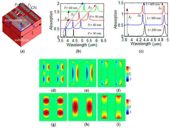 Figure 1a; only one unit cell was considered in the computational space, which contained two graphene nanoribbons. It provided some guidance for the sample fragments with close spacing of each graphene nanoribbon because it was difficult to fabricate a perfect array with one graphene nanoribbon. The x direction polarized incident wave propagated along the