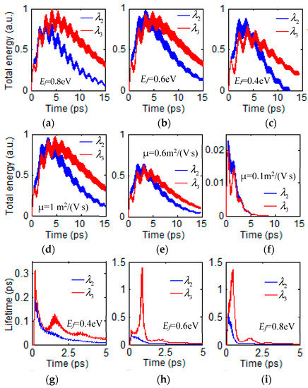Figure 6d–f, respectively. The total energy has a more rapid decay when carrier mobility μ decreased from μ = 1 m