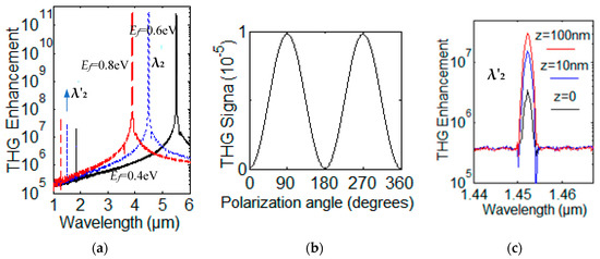 When the FW wave with one frequency is incident upon the GN grating, third-order nonlinearity will be excited. Log plot of the TH enhancement factor with three different Fermi energy