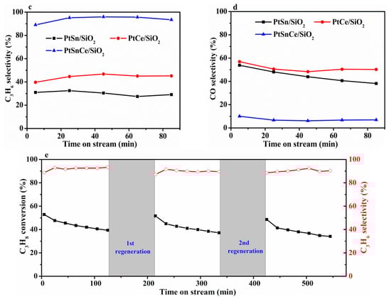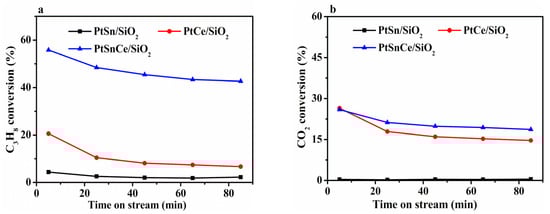 The time-on-stream (TOS) results of CO2-ODP over PtSn/SiO2, PtCe/SiO2, and PtSnCe/SiO2 are shown in Figure 1. Indeed, PtSn/SiO2 showed a very low propane conversion of 4.4% at a TOS of 5 min (Figure 1a). In contrast, a significantly higher propane conversion was achieved over the Ce-containing catalysts, and PtSnCe/SiO2 showed the highest initial propane conversion of 55.8%. Taking the activity as the propane conversion at a TOS of 5 min, an increased order of PtSn/SiO2 < PtCe/SiO2 << PtSnCe/SiO2 was observed. Moreover, the blank experimental results of CO2-ODP indicate a propane conversion of less than 2.5% over SnCe/SiO2 (Figure S2). Thus, the Pt species over the catalysts are responsible for converting propane, the activity of which is associated with the added SnO2 and/or CeO2. Where the initial activity indexed by the CO2 conversion at a TOS of 5 min (Figure 1b) was concerned, PtSn/SiO2 showed negligible activity. In contrast, a significantly high initial CO2 conversion of 26.4% over PtCe/SiO2 and 25.9% over PtSnCe/SiO2 was achieved. In the case of stability, Figure 1a,b clearly shows that PtSnCe/SiO2 was the most stabile catalyst at a TOS of 80 min, leading to the concurrently decreased conversions of propane and CO2 in the same order of PtSnCe/SiO2 > PtCe/SiO2 >> PtSn/SiO2 with increasing TOS.