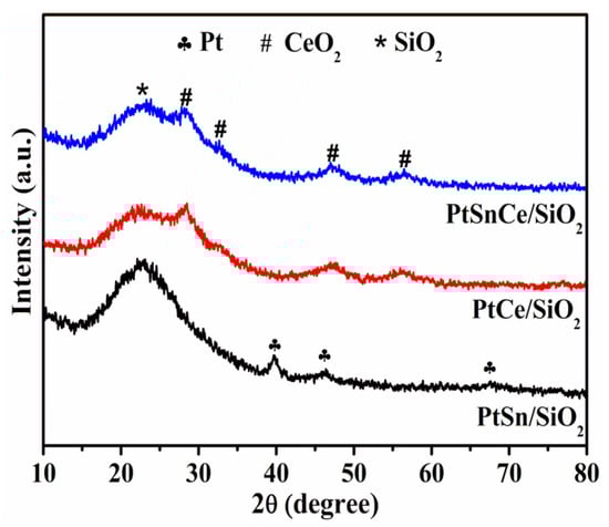 XRD patterns of the catalysts are shown in Figure 2. All of the catalysts exhibited a broad XRD peak at ~22.6°, corresponding to the amorphous nature of the SiO2 support []. In the case of PtSn/SiO2, the characteristic diffractions at 2θ of 39.8, 46.2, and 67.4° were clearly observed, which were assigned to (111), (200), and (220) crystal planes of the cubic Pt metal, respectively [,]. In contrast, when CeO2 was present, the XRD peaks ascribed to Pt metal disappeared, and only the characteristic diffractions at 2θ of 28.5, 33.1, 47.5, and 56.3° conclusively attributed to the (111), (200), (220), and (311) crystal planes of the cubic fluorite structure of CeO2, respectively [,], were clearly observed over PtCe/SiO2 and PtSnCe/SiO2. This indicates that the addition of Ce can significantly improve the dispersion of Pt metal, and the SnO2 species is present as the amorphous or highly dispersed nature.