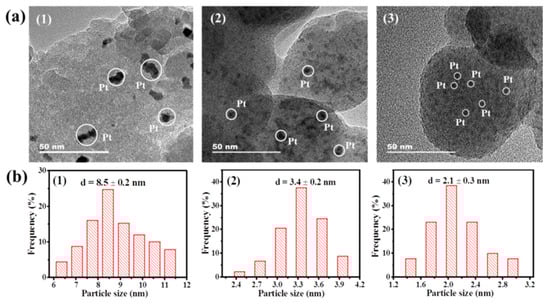 H2-O2 titration experiments were carried out on a Micromeritics Autochem 2920 instrument to determine the dispersion of Pt. For each test, a total of 150 mg of the sample was pre-reduced at 500 °C for 1 h in 10 vol% H2/Ar (30 mL/min). After cooling to 50 °C in Ar, a flow of 3 vol% O2/Ar (30 mL/min) was pulsed until the consumption peaks became stable. Subsequently, the sample was purged under an Ar flow for 1 h, and consecutive pulses of 10 vol% H2/Ar (0.50 mL) were performed. By assuming that the adsorption stoichiometry factor of Pt/H2 equals to 2/3, according to references [,], the dispersion of Pt was calculated using the following Equation (1).