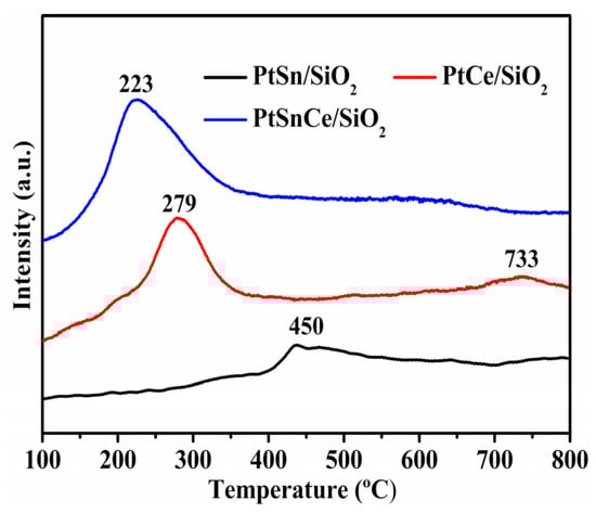 The redox properties of the catalysts were analyzed by H2-TPR. As shown in Figure 4, for the PtSn/SiO2 catalyst, a weak and broad reduction peak was observed at ~450 °C, which can be can be attributed to the reduction of SnO2 [,]. In the case of PtCe/SiO2, two reduction peaks were observed at 279 °C and 733 °C. The first peak at 279 °C was attributed to the reduction of active oxygen species over the CeO2 surface, while the very weak peak at 733 °C corresponded to the reduction of the lattice oxygen over the bulk CeO2 [,]. Concerning PtSnCe/SiO2, only one reduction peak was observed at 233 °C, attributed to the reduction of surface oxygen species. The reduction-peak temperature below 600 °C was continuously decreased in the order of PtSn/SiO2 >> PtCe/SiO2 > PtSnCe/SiO2, while the amount of the H2 consumption calculated from the reduction peak during H2-TPR below 600 °C (Table 2) was increased in the order of PtSn/SiO2 << PtCe/SiO2 < PtSnCe/SiO2, leading to the greatest reducibility of PtSnCe/SiO2. It has been reported that the hydrogen spillover effect induced from the interaction between the Pt and SnO2/CeO2 can accelerate the reduction of oxygen over the catalyst, and a higher dispersion of Pt commonly leads to a greater reducibility [,]. Based on this explanation, the H2-TPR results were well understood when the dispersion of Pt, as discussed in Section 3.2, was taken into account. As a result of the highest Pt dispersion over PtSnCe/SiO2, the reduction of oxides over the catalysts was enhanced due to the strongest hydrogen spillover effect, leading to the lowest reduction-peak temperature and the greatest amount of H2 consumption.