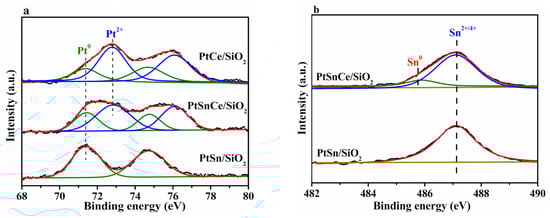 As show in Figure 5a, the binding energies at around 71.4 eV for 4f7/2 and 74.7 eV for 4f5/2 were clearly observed over PtSn/SiO2, indicating the presence of metallic Pt0 []. In contrast, when CeO2 was added, the binding energies of Pt 4f were clearly increased, and the XPS peaks at 72.8 eV for 4f7/2 and 76.1 eV for 4f5/2 assigned to Pt2+ species [] were clearly observed over PtCe/SiO2 and PtSnCe/SiO2. Following the results of deconvolution of the Pt 4f peaks (Figure 5a), the relative content of Pt0 and Pt2+ was calculated by respective peak area. As shown in Table 2, PtSn/SiO2 showed the exclusively metallic Pt species, which is consistent with XRD results (Figure 2). Contrarily, the relative content of Pt2+ was as high as 69.5% and 66.9% for PtCe/SiO2 and PtSnCe/SiO2, respectively. According to references [,], the presence of Pt2+ over the CeO2-containing catalysts originates from the strong interaction between Pt and CeO2, which may be the key reason for the greater dispersion of Pt over PtCe/SiO2 and PtSnCe/SiO2 than over PtSn/SiO2. This is supported by the TEM and H2-O2 titration results (Figure 3 and Table 1). As shown in Figure 5b, the Sn 3d5/2 at about 487.0 eV was deconvoluted to analyze the chemical state of Sn. In the case of PtSn/SiO2, a symmetric Sn 3d5/2 XPS peak with a binding energy of 487.2 eV was observed, indicating the presence of only SnOx species, as reported in []. However, besides oxide species, a small amount of Sn0 species located at 485.7 eV was observed over PtSnCe/SiO2. As for the reason, it is noteworthy that PtSnCe/SiO2 showed a slightly higher content of Pt0 than PtCe/SiO2 (Table 2), which may originate from the improved interaction between SnO2 and Pt due to the presence of CeO2. This coincides well with the presence of Sn0 species, indicating the possible formation of Pt-Sn bimetallic nanoparticles [,].