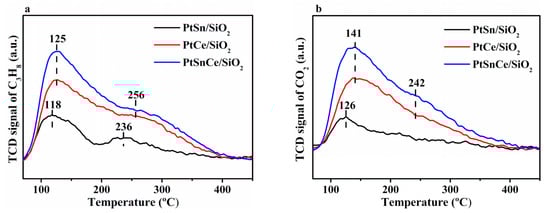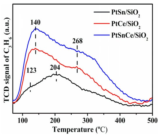 As indicated by the results in Section 3.1, the selectivity of propylene varied to a relatively large extent over the PtSn/SiO2, PtCe/SiO2, and PtSnCe/SiO2 catalysts (Figure 1c). According to the analysis of product distribution (Figure 1d), this is explained by the simultaneous occurrence of CO2-RP in the course of CO2-ODP. By correlating the characterization results of Section 3.2, Section 3.3, Section 3.4 and Section 3.5, the significant propylene selectivity over PtSnCe/SiO2 can be explained as the Ce promoted interaction between Sn and Pt, which favors the breaking of C-H bonds in propane [,]. However, in addition to the side reaction of CO2-RP induced from propane, the selectivity of propylene is also determined by its possible secondary reactions, including successive polymerization (coke deposition) and further cracking, owing to the difficult desorption of propylene from the surface of catalysts []. For further insight, C3H6-TPD experiments were performed, and the results are given in Figure 8. A very broad desorption signal was observed in the temperature range of 100 to 450 °C for all of the catalysts, indicating the varied strength of propylene adsorption on the surface of the catalyst []. In the case of PtSn/SiO2, two overlapping peaks were observed at about 123 °C and 204 °C. In contrast, both the peak temperature and amount of desorbed propylene over PtCe/SiO2 and PtSnCe/SiO2 were clearly higher than over PtSn/SiO2, indicating a stronger adsorption of propylene. Furthermore, as given in Table 3, the amount of adsorbed propylene was calculated below 450 °C during C3H6-TPD and was found to increase in the order of PtSn/SiO2 << PtCe/SiO2 < PtSnCe/SiO2. When propylene selectivity is compared with the amount of propylene adsorption, exactly the same trend is found, i.e., the greater the amount of propylene adsorption, the higher the propylene selectivity. This result is contradictory to the common expectation. Considering the dominant byproduct of CO in the course of CO2-ODP (Figure 1d), it can be concluded that the simultaneous occurrence of CO2-RP plays a key role in determining the propylene selectivity in comparison with the secondary reaction of propylene.