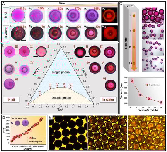 (A) The phase separation process of TPGDA/Ethanol/TAA droplets in silicon oil and PVA solution, respectively. (B) The multi-emulsion state of droplets in different compositions showed in the ternary phase diagram. (C) The effect of continuous phase flow rate (fixed disperse phase flow rate as 1 mL/h) on the size of prepared droplets in microfluidic systems and the corresponding diameter change curve. (D) The fit plots of initial droplet size versus squared phase separation time. (E) Microscopic images of one-layer, two-layer and three-layer microspheres after the LLPS droplets cured in PVA solution. All scale bars are 100 μm.