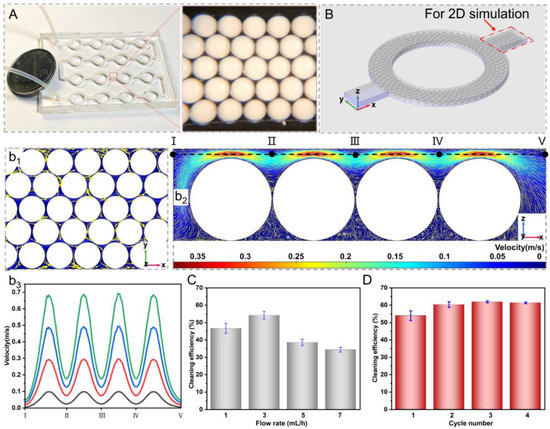 (A) Optical images of the MISP integrated microfluidic chip and the details of the MISP arrangement by self-assembly. (B) The numerical simulation of the fluid flowing in the vertical (z = 110 μm, b1) and horizontal directions (y = 110 μm, b2), and the cut-off velocity analysis (b3) corresponding to b2. Effect of flow rate (C) and cycle numbers (D) of adsorption in the chip on cleaning efficiency.