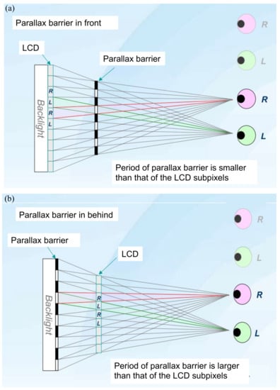 In 1896, Auguste Berthier [14] proposed a “parallax barrier” to create an auto-stereogram. Its mechanism is described in Figure 2, showing that the parallax barrier is (a) in front of the display panel or (b) behind the display panel. The parallax barrier is an interlace of transparent and opaque stripes. For the left eye, only the pixels labeled as L are perceived, and the pixels labeled as R are blocked. In the same way, only pixels labeled as R are perceived by the right eye. Thus, the left and right eyes watch different images, and it generates binocular parallax. In Figure 2b, the parallax barrier is inserted between the display panel and the backlight to make the barrier invisible, so people would not be aware of the existence of black strips. The details of the optical design can be found in Huang’s article [15].