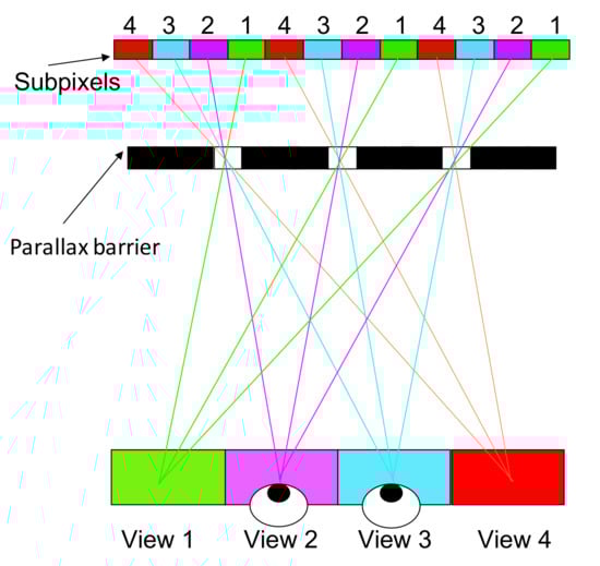 The method can be modified into multiple views by changing the pitch of the barrier. Figure 3 demonstrates a four-view design, the pitch of the parallax barrier is slightly smaller than four times of the subpixel pitch to converge the light into a single view, and the width of the transparent region determines the brightness. Wider transparent region increases the brightness, but induces more crosstalk. A common width is one quarter of the pitch to avoid significant crosstalk. A multiview design offers a motion parallax on top of a binocular parallax, so it allows multiple people to move around and to watch 3D images. However, the brightness and horizontal resolution becomes only 1/N, where N is the view number. The low brightness remains a problem of the parallax barrier; in Section 3.2, a lenticular method is introduced to reconcile the brightness problem.
