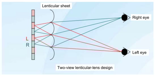 The parallax-barrier method faces the degradation of brightness. To overcome the problem, Hess [22] invented a lenticular-lens method in 1915, which is described in Figure 4. The lenticular sheet is a one-dimensional cylindrical micro-lens array which replaces the role of the parallax barrier and collimates the diffused light from pixels into a specific direction, being received by a specific eye in the end. Hence, two eyes receive different images and merge them into an image with depth. Since the lenticular sheet is a transparent film, none of light is blocked; hence, it maintains the level of brightness. This is a remarkable advantage over a parallax barrier. On the other hand, a multiview setup can be implemented with the pitch of the lenticular array slightly less than N times of the width of a subpixel. However, it still suffers from the 1/N reduction in resolution.
