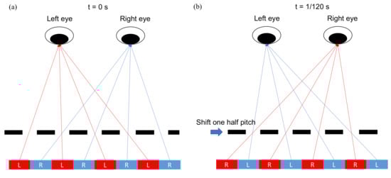 The parallax barrier slits are shifted by one half pitch within 1/120 s, so both eyes can perceive red and blue pixels, and then the resolution is retained. (a) As t = 0 s, the parallax barrier is at the original place. (b) As t = 1/120 s, the parallax barrier shifts one half pitch.
