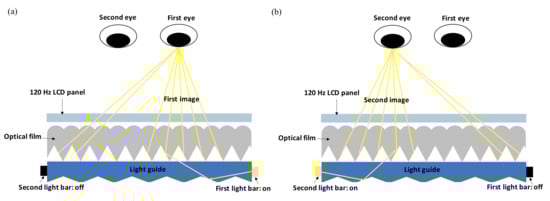 (a) The first light bar is turned on and projects the first image to the first eye via the guide of the optical film. (b) Similarly, the second light bar projects the second image to the second eye. The two light bars are turned on and off alternatively. (Reproduced with permission from ref. [42]).