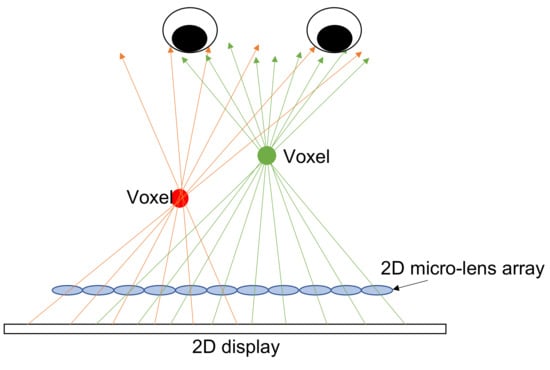 Integral imaging (InIm) was invented by the Nobel laureate in physics, Gabriel Lippmann in 1908, and he coined this technique as “integral photography” [46]. Figure 9 shows the idea behind InIm: A voxel [2] is formed by intersecting rays being emitted from the 2D display and being directed to the position of voxel by the 2D micro-lens array. In other words, the multiple perspectives of a voxel are recorded by the 2D micro-lens array and reconstructed by the reversed way, and it presents a full parallax. If the ray density is high enough to allow at least two rays into a single eye, then it shows the accommodation effect [47] that resolves the accommodation-convergence conflict [6]. Hence, it mitigates the fatigue problem. The range of pupil diameter is 4–6 mm [48], indicating the ray separation is 2–3 mm when arriving at the eyes, so hundreds of rays in horizontal and vertical directions are required to cover a head movement in hundreds of millimeters, and the overall ray number could be tens of thousands; thus, the native display resolution must be tens of thousands-fold the perceived resolution, so an extremely-high-resolution display is required.