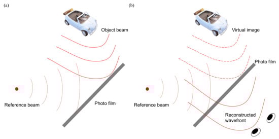 Holography was invented by the Nobel laureate, Dennis Gabor [53] in 1947. It records all the information of the light field, consisting of its amplitude and phase. In a reversed manner, the light field is reconstructed as a 3D image. Since holography does not mimic 3D with 2D images, it builds the authentic 3D wavefront instead; hence, holography is regarded as the ultimate 3D display. The formation of holography, in Figure 10, is that the object beam interferes with the reference beam coherently and the interference fringe is recorded on a photo film. Since the fringe carries the phase and amplitude information of the object beam, we can reconstruct the wavefront of object beam in reversal by illuminating the hologram with the original reference beam, so eyes perceive not only the amplitude but also the phase that produces the sensation of depth.