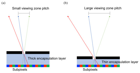 (a) The viewing zone pitch is small in a thick-encapsulation-layer system, such as LCD, that has a thick front glass around 0.5 mm. (b) The thin-encapsulation-layer system, e.g., OLED/Micro-LED has an ultra-thin film less than 1 µm, which shows a large viewing zone pitch.