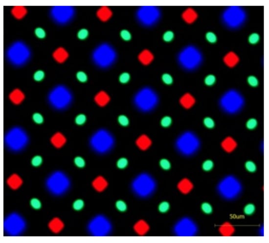 On the other hand, OLED usually has a pentile-pixel arrangement (Figure 12), which is more sophisticated than LCD’s RGB arrangement, and it requires a special pattern design for the parallax barrier. Lee and Kim have shown how to design the parallax barriers in their work [67,68]. In our group, we also developed a slanted-barrier autostereoscopic display with OLED, whose slanted angle is , owning a 12-view, 166-ppi, viewing angle up to 50, because we removed the cover glass and took the advantage of the thin encapsulation of OLED. The left, middle, and right perspectives are shown in Figure 13, and it shows the horizontal parallax that the relative positions of petals and trunk change over views.