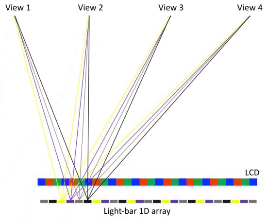 This light-stripe method can be generalized to time-multiplex display with multiple sets of light-stripe arrays. In Figure 15, four light-stripe sets are introduced, and they are manipulated with the lighting on and off in the order of yellow, purple, grey, and black cyclically. Each light-stripe set projects a quarter of the pixels to a single eye, and four sets of light stripes allow all the pixels to be perceived by a single eye. Hence, it achieves a full resolution with time-multiplex lighting on-and-off. For the four-view example, it turns 240 Hz lighting on and off. Based on the fast response of Micro-LED, it is easy to turn high-frequency lighting on and off. ITRI [45,61] has demonstrated another variant with light stripes and a lenticular sheet to collimate the backlight into a single direction; turning on different light-stripe sets directs the collimated backlight into different directions, and full-resolution images are delivered into various directions.