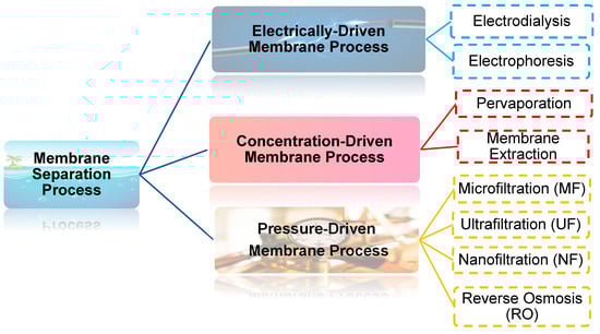 Water pollution by heavy metals is known to be toxic and harmful to human health and the environment. As the human population grows, water pollution cannot be avoided due to humankind’s activities in various sectors, including industry, agriculture, and service. To evade this problem, several treatment technologies have been investigated by Crittenden et al. [], such as reverse osmosis, disinfection, granular filtration, gravity separation, coagulation–flocculation, air stripping and aeration ion exchange, adsorption, and membrane filtration. Of these conventional treatments, membrane filtration technology has gained widespread popularity because of its numerous benefits in water treatment and its ability to achieve the required standard. Its benefits include space efficiency, remarkable energy reduction, and cost effectiveness []. In comparison, other conservative treatments are well-known for their ineffectiveness as well as production of hazardous products such as trichloromethane []. Furthermore, membrane filtration technology has the potential to close the gap between the economic and sustainability, environmental friendliness due to its less or no chemical requirement, and widespread accessibility []. As depicted in Figure 1, the membrane separation process is divided into three groups: the electrical-driven membrane process (electrodialysis and electrophoresis), the concentration-driven membrane process (pervaporation, membrane extraction), and the pressure-driven membrane process (microfiltration, ultrafiltration, nanofiltration, and reverse osmosis).
