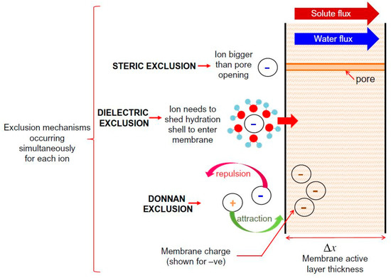 The advantage of this mechanism is that it is easy to understand since it separates solutes based on size. However, since NF membrane is exhibited bysmall pores, the interaction between solutes (mainly ionic solutes) and membrane cannot be governed by steric hindrance alone. Dependence on steric hindrance can lead to poor rejection of two different solutes that have similar sizes. NF membranes have pores that can reject unwanted solutes (retentate) while allowing wanted solute (permeate) to pass through the pores even though those two solutes have the same size. The separation of ionic species by NF membranes strongly depends on the membrane charge and pore size []. Therefore, knowledge of the surface and pore characteristics of NF membranes is essential as it can allow for predictions of membrane separation behavior. Since the sieving rejection mechanism is relatively easy to understand, this review will focus more on the non-sieving mechanism.