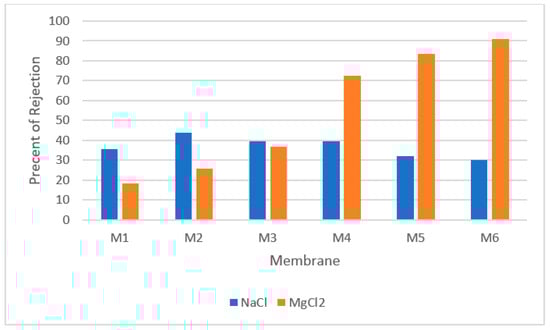 Furthermore, the performance of fabricated polyamide (PA) NF membranes via interfacial polymerisation using m-xylylenediamine (m-XDA) and polyethyleneimine (PEI) as aqueous monomers were evaluated []. Liu and co-researchers controlled the concentration ratio of m-XDA and PEI from 1:0, 4:1, 3:2, 2:3, and 1:4 to 0:1 and named them M1, M2, M3, M4, M5, and M6. The researchers also investigated the selectivity of Na+ and Mg2+. The results showed that the addition of PEI to aqueous solution increased the rejection of NF membrane to magnesium chloride (MgCl2) and magnesium sulphate (MgSO4), but not to NaCl or Na2SO4. This is because both MgSO4 and MgCl2 have divalent cations (Mg2+), while NaCl and Na2SO4 only have monovalent cations (Na+). Therefore, Mg2+ rejection is determined by Donnan exclusion, whereas monovalent Na+ rejection is determined by steric hindrance (since Na+ has weak electrostatic repulsion). Figure 7 depicts the rejection of Na+ and Mg2+ by NF membranes. It shows that the rejection of Na+ in the M1–M6 membranes were not consistent since high PEI concentration contributed to low degree cross-linking and resulted in the reduction of steric hindrance.