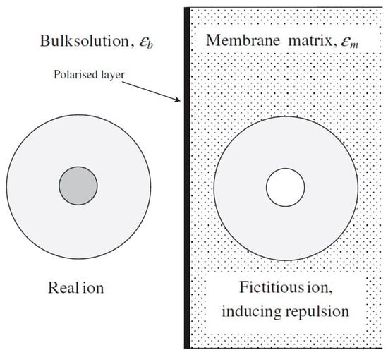 As mentioned in a previous section, it has been determined that there is an additional separation mechanism due to the unrealistic magnitude of membrane charge density predicted by DSPM. Therefore, Yaroshcuk et al. [] introduced dielectric exclusion during the separation process by providing an in-depth analysis of this exclusion mechanism. The researchers stated that dielectric exclusion occurs when an ion interacts with the bound electrical charges generated by the ion at the interface of two materials with different dielectric constants: in this case, the membrane matrix and the solvent. It was determined that the ion polarizes the two media in accordance with their relative dielectric constants, forming a polarisation charge distribution at the discontinuity surface. This phenomenon is called production of image forces and is illustrated in Figure 8. It shows that if the membrane’s dielectric constant is less than the solvent’s, this image force will always be repulsive for both anions and cations.
