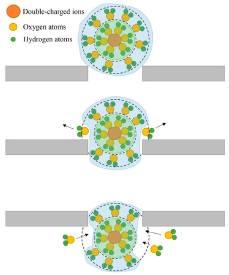 The researchers discussed why the rejection of Ca2+ is stronger than Mg2+ in terms of hydration radius. The first hydration radius of Ca2+ is bigger than that of Mg2+. The unique feature of divalent ions is their structure, as two layers of hydration shell surround the ions. The first layer is dense while the second layer (outer layer) is elastic, and this layer weakly connects with nuclear ions. If ions have a radius larger than the pore size, the ions can still pass through the pore because the water molecules adjust its outer hydration shell so that the inner hydration shell can pass through the pore. Figure 10 explains the mechanism of ions passing through the pore despite having a radius larger than the pore. Figure 10 displays several water molecules from the outer hydration shell being replaced, which allows the first hydration shell to easily pass through the pore. After passing through the pore, the second hydration shell attracts other water molecules in the permeated region to form a new hydration shell.