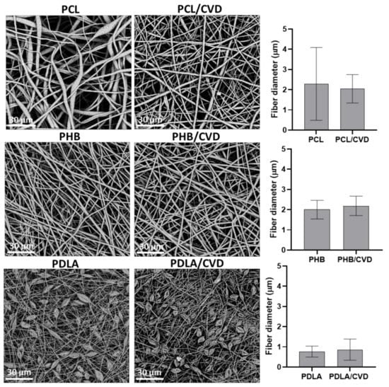 (Left) Scanning electron microscopy (SEM) micrographs of the different PCL, PHB, and PDLA fibers with and without CVD. (Right) The average fiber diameter of the different loaded PCL, PHB, and PDLA fibers with and without CVD. Values are presented as the mean ± S.D.