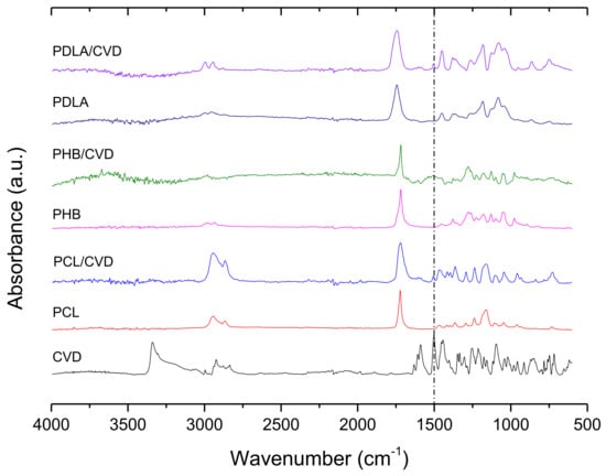 ATR-FTIR spectra of samples with different polymer matrices (PCL; PCL/CVD, PHB, PHB/CVD, PDLA; PDLA/CVD) and commercial CVD. For comparison, the C=C stretching bond in the aromatic ring of CVD has been highlighted with a dashed-dotted line.