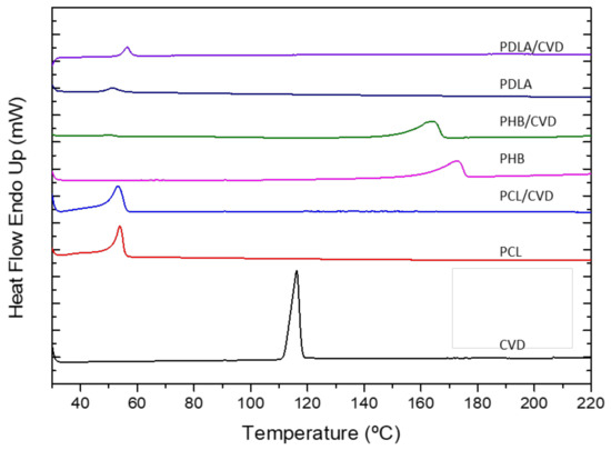 DSC thermograms of different polymer matrices with and without CVD (PCL; PCL/CVD; PHB, PHB/CVD; PDLA; PDLA/CVD) and the commercial CVD powder.