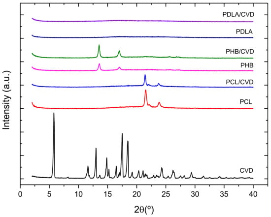 The WAXS patterns of the CVD commercial powder and loaded CVD fibers were also taken to further assess the crystalline phase of the materials. Figure 5 shows the diffractograms of the CVD-loaded fibers and commercial CVD powder. The CVD diffractogram showed several sharp peaks, attributed to the crystalline nature of the drug, as also observed in other studies [18]. As per the CVD-loaded electrospun mats, the intensity peaks of PCL/CVD and PHB/CVD were associated with the crystallinity of the polyesters. On the other hand, PDLA/CVD fibers did not show any peaks, highlighting the amorphous state of this polymer. Interestingly, the presence of the CVD diffraction peaks was not observed in any of the diffractograms of the CVD-loaded fibers. Furthermore, the lack of CVD peaks remained for all the tested loaded fibers after 2 months of storage at 30% R.H. (results not shown). The combination of the DSC and WAXS data clearly indicated that CVD was in the form of a solid amorphous dispersion within the electrospun materials.