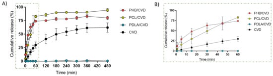 (A) CVD release profiles from fibers PCL/CVD, PHB/CVD, PDLA/CVD, and from commercial CVD. (B) CVD release within the first hour. Graphs are presented as the mean ± S.D. (n = 3).