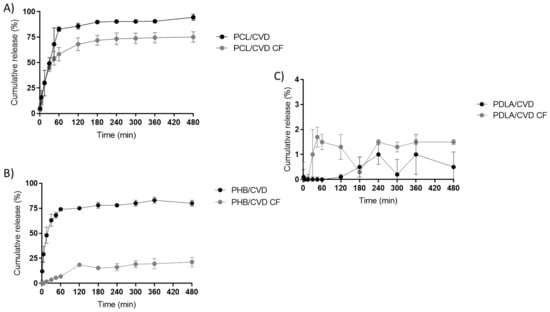 In order to assess the comparative effectiveness of the electrospinning technology with other forms of manufacturing films, similar films produced by the solvent casting method were also investigated for the delivery of CVD. Figure 7 shows the drug release profile of PCL/CVD, PDLA/CVD, and PHB/CVD alongside their casting film counterparts (PCL/CVD CF, PDLA/CVD CF, and PHB/CVD CF, respectively). When compared with their homologous cast films, the electrospun fibers released CVD faster, but for PDLA fibers. The total release after 8 h was typically higher for the electrospun PHB and PCL fibers than for the cast films. Likewise, a two-phase release was observed, with an initial burst followed by a slower release. Overall, it can be stated that electrospun fibers, especially PHB/CVD, had a faster CVD release behavior than their cast film counterparts, except for the case of PDLA, which presented a similar behavior of slow-release rate for both fibers and cast films. Polymer characteristics such as crystallinity, Tg, material density, CVD distribution, and phase morphology will certainly affect the release kinetics for the same chemistry [47].