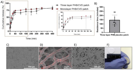 (A) Release rate profile of PHB/CVD as a mono and three-layer patch. The release rate profile has been zoomed out to analyze the differences across the profiles in the first two hours, as well as to correlate the release kinetics of the API with the residence time of the patch in the mucosa (red star and dashed line). (B) In vivo sublingual mucoadhesive performance of the PHB multilayer patch without CVD (PHB multilayer patch). (C) Scanning electron microscope (SEM) micrographs of the backing layer (PCL), (D) SEM micrographs of PHB-CVD layer processed by energy-dispersive X-ray spectroscopy (EDS). (E) SEM micrographs of the mucoadhesive layer (60PEO/30PVP/10EC) and (F) macroscopic image of the multilayer patch system. Graphs are presented as the mean ± S.D. (n = 3).