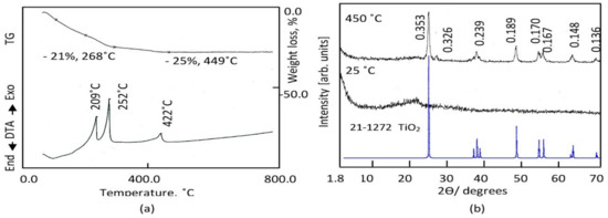 Organic solvent can act as a modifier to slow down the hydrolysis reaction of titanium precursor. Figure 2a shows the thermal analyses of the prepared sample TTO through the thermal gravimetric curve and the differential thermal analysis.