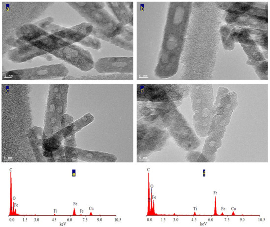 In the first stage of preparation, Figure 9 showed that titanium iron oxide nanorods were formed and an excess of iron oxide was produced as small nanoparticles. Figure 9a,b indicated that dimensions of the nanorods are 60 nm in length and 10 nm in width. The size of the nanoparticles was less than 5 nm. Figure 9c shows that the nanoparticles of iron oxide tend to diffuse inward through the surface of titanium iron oxide nanorods. Small voids were observed in some nanorods as seen in Figure 9d.