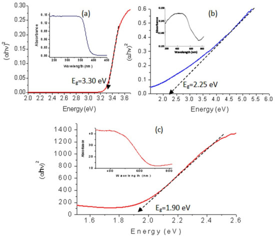 UV-Vis absorbance and band gap of (a) TTO-450, (b) TF-2 and (c) TF-3.