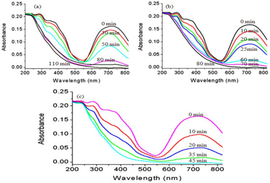 In the current study, the green dye of Naphthol green B was used as an example for colored pollutants. The photo activities of the prepared titanium dioxide and their nanocomposites with their different morphology were studied and used during photocatalytic degradation of Naphthol green B dye as photocatalysts. After irradiating the aqueous solution of the dye in presence of the UV light and one of the prepared photocatalysts, the absorbance of the liquid portion was measured to determine the concentration of Naphthol green B at a certain time. The degradation of the organic structure of Naphthol green B was determined by the reduction of its absorbance at λmax of 714 nm as seen in Figure 13. Also, the absorbance of the organic phenyl groups of the dye at 320 nm and 400 nm gradually decreased with irradiation time of UV light.