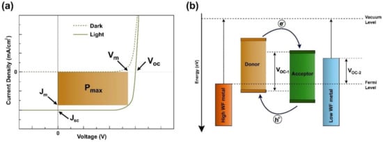 The ratio of collected photogenerated charges and the number of incident photons is related to the external quantum efficiency (EQE) of the OSC. is the main driving force for charge separation once the exciton reaches the donor/acceptor interface [55,56]. is the difference of WFs between the quasi-Fermi levels of holes (EF.h) in the HOMO level of the donor and the quasi-Fermi levels of electrons (EF,e) in the LUMO level of the acceptor in a BHJ under the formation of ohmic contacts with the cathode and anode (depicted as in Figure 2b). If a Schottky contact appears in both BHJ/electrode interfaces, the would decrease and would depend on the difference between the WFs of the two metal contacts (depicted as in Figure 2b) [57,58]. is the ratio between the maximum power output () and the maximum attainable power output (). describes the maximum power drawn from the device and is the product of the maximum current () and voltage () (see Figure 2a) [59], as follows: