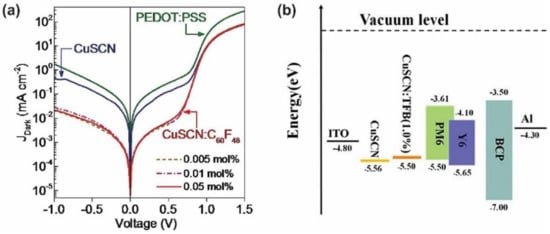 (a) J-V curves of CuSCN:C60F48 under dark conditions. Adapted with permission from [213]. Copyright 2018, John Wiley and Sons. (b) Energy level alignment of ITO/CuSCN, CuSCN:TFB(1.0%)/PM6:Y6/BCP/Al OSCs. Adapted with permission from [214]. Copyright 2020, American Chemical Society.