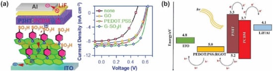 The application of UVO irradiation has shown excellent efficiency in reducing GO in large-scale OSCs manufacturing. Xia et al. [228] and Rafique et al. [229] exposed GO to UVO treatment, resulting in optimized performance in P3HT:PC71BM and PCDTBT:PC71BM blend systems. UVO oxidizes the surface of GO and removes CO2 molecules, leaving a uniform, smoothed, and conductive film. Ultraviolet irradiation was controlled to remove only C-O bonds from the GO surface. UVO-treated GO films allowed for exceeding the value of FF and Jsc obtained from PEDOT: PSS. Taking advantage of graphene’s chemical structure, the functionalization is very promising for obtaining desirable properties in HTLs, such as high hole mobility, charge collection, transparency, and stability, among others. Zhao et al. fabricated highly stable P3HT:PC71BM-based OSCs with a PCE of 3.56% by forming covalent bonds between graphene and sulfanilic acid through C-N linkers [230]. The covalent functionalization increased the WF that enhance the interface’s charge transport and the overall photovoltaic characteristics (see Figure 11a). Ali et al. confirmed the potential for tuning the bandgap and electrical properties when reduced and sulfonated GO films were applied as HTLs for a wide range of donor-acceptor systems [231]. Other approaches like non-covalent phosphorylation and fluorination have been remarkably effective in enhancing the charge collection and transport via inducing low ohmic contact [232,233]. The presence of the phosphate ester or fluor in the surface of GO increased the WF of ITO/GO and tuned the HOMO level of the donor by the p-doping effect. Fluorinated GO (F5-GO) was reported to work as an interlayer between ITO and PEDOT:PSS [234]. This material improved hole transport, resulting in a low Rs of 2 Ωcm2 and a PCE of 7.67% for PTB7:PC71BM-based OSCs. Park et al. reported an orthogonal printable HTL by spray casting a highly stable dispersion of fluorine-functionalized reduced graphene oxide (FrGO) [235]. By decreasing the sheet size to 0.3 µm, the PCE increased to 9.27 and 9.02% for PTB7-Th:EH-IDTBR and PTB7-Th:PC71BM-based OSCs, respectively. This improvement was attributed to the hole-transport efficiency, decreased leakage current, and higher conductivity of the FrGO layers. Zhen et al. reported graphene-MoS2 hybrid thin films via liquid-phase graphene exfoliation, improving the charge transportation as an interlayer to achieve a PCE 9.5% [236]. This interlayer increased the device stability by retaining 93% of the initial PCE after 1000 h at room temperature. Shoyiga et al. reported reduced graphene oxide-anatase titania (RGOT) nanocomposites by hydrothermal synthesis [237]. RGOT HTL is an efficient charge-transport channel whose higher conductivity and exciton dissociation efficiency decreased the rates of electron-hole recombination (see Figure 11b), resulting in a high Jsc, low Rs, and, thus, improved photovoltaic performance.