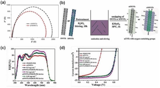 (a) Impedance spectra of OSCs with c-MWNTs and af-MWNTs HTLs. Adapted with permission from [252]. Copyright 2019, Elsevier. (b) Schematic representation of u-SWNTs and u-MWNTs synthesis, (c) EQE of u-SWNTs, SWNTs, and PEDOT:PSS, and (d) J-V curves of the OSCs with u-SWNTs HTLs. Adapted with permission from [254]. Copyright 2020, Royal Society of Chemistry.