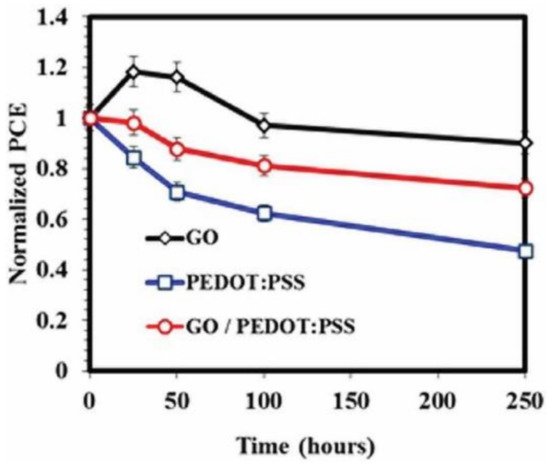 Li et al. reported a PCE of 9.44% for OSCs with V2O5:PEDOT:PSS as HTL due to an enhanced Jsc and FF, smaller Rs, and larger Rsh [309]. The incorporation of V2O5 offered an effective path for exciton extraction and suppressed charge recombination, reflected by a larger hole mobility and a higher conductivity. The composite HTL surface was uniform and smooth, related to V2O5 NPs filling the pinholes in PEDOT:PSS. Furthermore, better wetting and physical contact were obtained between the photoactive layer and the HTL as well as enhanced crystallinity of the active layer. Molybdenum oxide (MoOx) NPs/PEDOT:PSS HTLs were blade coated in inverted OSCs based on PTB7-Th:PC60BM, resulting in an increased FF and enhanced PCE of 7.4% [310]. The modification of PEDOT:PSS with MoO3 mitigated the degradation of non-fullerene OSCs based on PM6:IT-4F by suppressing the interfacial reaction between PEDOT:PSS and IT-4F [311]. MoO3-PEDOT:PSS hybrid HTL improved the device’s operational stability, which was five times longer than reference devices. The hybrid HTL also improved the hole mobility favoring the charge extraction. Zinc oxide-doped single-carbon nanotubes (CNT) were incorporated in PEDOT:PSS as an anode buffer layer (ZnO:CNT/PEDOT:PSS), showing excellent transmittance and a smooth morphology [312]. P3HT:PCBM-based OSCs with an HTL containing 2.5% ZnO:CNT showed an improved PCE of 4.1%, enhanced Jsc and FF, and reduced Rs. CNT provided surface homogeneity, and ZnO prevented humidity uptake. The device parameters decreased at a slower rate than PEDOT:PSS devices under a nitrogen environment. Zheng et al. fabricated fullerene-free OSCs with tungsten oxide WOx NPs in PEDOT:PSS as HTL [313]. The system architecture ITO/WOx:PEDOT:PSS/PM6:IT-4F/PFN-Br/Al achieved a high FF of 80.79% and enhanced PCE of 14.57%. A more balanced hole and electron mobility was obtained for WOx:PEDOT:PSS based of BHJ OSCs measured as a ratio of 0.88, which contributed to increase the FF. The longer lifetime of carriers and faster extract time of WOx:PEDOT:PSS also benefited the device parameters. WO3/PEDOT:PSS bilayer was used as HTL in inverted SMD2: ITIC-Th-based OSCs [314]. An optimized cell achieved a high PCE of 10.3%, with enhanced Jsc, Voc, and FF. The WO3/PEDOT:PSS device presented increased Rsh and decreased Rs by a well-matched energy level alignment, high hole mobility, a more balanced charge-carrier transport, and increased photostability. Furthermore, flexible inverted OSC modules were fabricated by slot-die coating achieving a PCE of 5.25% and a power output of 419.6 mW. A layer of hydrogen molybdenum bronze (HxMoO3) with PEDOT:PSS layer was also used in all solution-processed non-fullerene OSCs based on PM6:IDIC:Y6 [315]. Phosphomolybdic acid (PMA) in PEDOT:PSS layers were tested in different organic fullerene-based OSCs, showing good performances [316]. GO, a two-dimensional carbon material, has also been investigated to modified PEDOT:PSS as hole-transport materials in different OSCs. The Oleyamine-functionalized GO/PEDOT:PSS layer on PBDB-T:ITIC [317], PEDOT:PSS treated with GO layers on PTB7:PC71BM devices [318], on P3HT:PC60BM devices [319], on P3HT:PCBM devices [320], on inverted P3HT:PCBM OSCs [321], on inverted P3HT:PC71BM OSCs [322], and on reduced GO-germanium QDs modified PEDOT:PSS on P3HT:PCBM [323]. Raj et al. reported the fabrication of PTB7:PC70BM-based OSCs with PEDOT:PSS:GO, resulting in enhanced PCE of 7.68% [324]. The modified HTL showed a fine fiber-like structure that improved the conductivity. GO showed to increase the device resistance degradation. GO is generally prepared by variations of the Hummers method using graphite powder as the starting material [325,326]. PEDOT:PSS:GO was also tested on P3HT:PC61BM-based OSCs, showing an increased Jsc, FF, and a 14% higher PCE than a reference device [327]. GO in the HTL reduced the HOMO-LUMO gap and the Rs, improving the hole mobility and the energy level matching. A double-decked GO/PEDOT:PSS HTL in PCDTBT:PC71BM-based OSCs was reported by Rafique et al. [328]. The modified HTL provided a better hole extraction and transportation by a suitable WF of GO (4.9 eV) and PEDOT:PSS (5.1 eV) that well-matched energy levels. This device showed an improved PCE of 4.28% ascribed to an increased charge-carrier mobility, Jsc, Voc, and FF, and a reduced Rs. Besides, better stability than PEDOT:PSS was reached, since GO served as a barrier that protected ITO corrosion due to the acidic nature of PEDOT:PSS (see Figure 17). Similarly, improved photovoltaic stability was achieved with GO/PEDOT:PSS HTLs in P3HT:PC60BM devices [329]. This device showed an increased Rsh and a decreased Rs, which facilitate the hole transportation. The composite HTL was smooth and uniform, contributing to an improved device performance with a PCE of 4.82%. Nitrogen-doped graphene quantum dots (nGQDs) were blended with PEDOT:PSS HTLs in PTB7:PC71BM-based OSCs, resulting in an enhanced PCE of 8.5% [330]. The modified HTL improved the charge-carrier transport, increased the hole mobility, and suppressed charge recombination. The nitrogen doping led to a high content of quaternary nitrogen, enhancing the electrical conductivity of GQDs. UV-ozone (UVO)-treated GO/PEDOT:PSS bilayer in OSCs based on PCDTBT:PC71BM presented an improved PCE of 5.24% [331]. An increased Jsc, Voc, and FF were obtained in the cells using the modified HTL and improved ambient stability, retaining above 90% of initial PCE after 240 h. The enhanced conductivity was ascribed to the reduction of oxygen content in GO after UVO treatment.