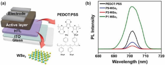 (a) Schematic representation of a WSe2-PEDOT:PSS HTL-based OSC and (b) PL spectra measured from structure of glass/PEDOT:PSS and P-WSe2-based devices. Adapted with permission from [333]. Copyright 2018, IOP Publishing Ltd.