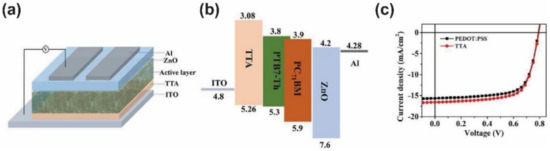- Liu, L.; Zhou, S.; Zhao, C.; Jiu, T.; Bi, F.; Jian, H.; Zhao, M.; Zhang, G.; Wang, L.; Li, F.; et al. TTA as a potential hole transport layer for application in conventional polymer solar cells. J. Energy Chem. 2020, 42, 210–216. [Google Scholar] [CrossRef] [Green Version]