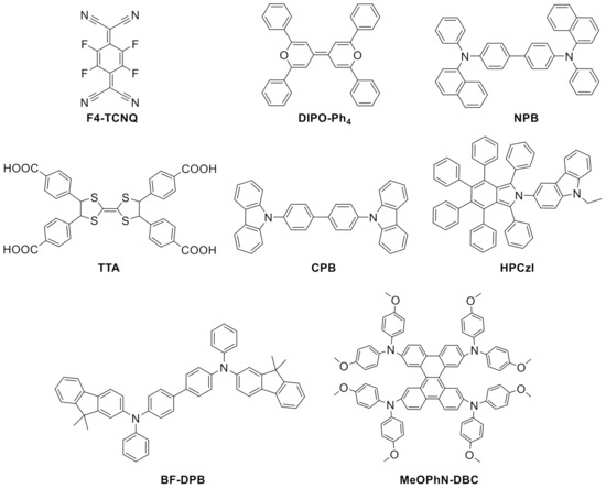 - Xu, X.-P.; Li, S.-Y.; Li, Y.; Peng, Q. Recent progress in organic hole-transporting materials with 4-anisylamino-based end caps for efficient perovskite solar cells. Rare Met. 2021, 40, 1669–1690. [Google Scholar] [CrossRef]